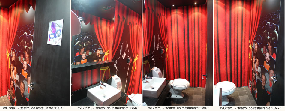 Abaixo é possível visualizar um projeto realizado onde a designer não poupou a sua criatividade e humor e utilizou técnica de perspectiva e profundidade equilibrando o lúdico com a realidade em 07 banheiros individuais de um restaurante na capital paulista. Confira:
